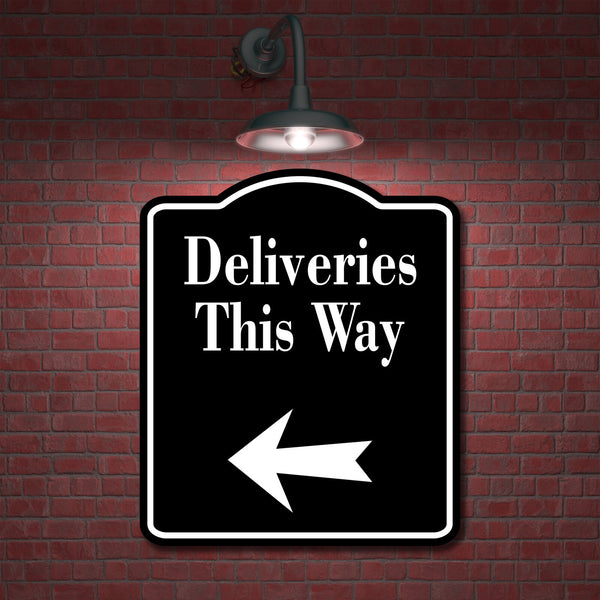Deliveries This Way Left Arrow BLACK Aluminum Composite Sign